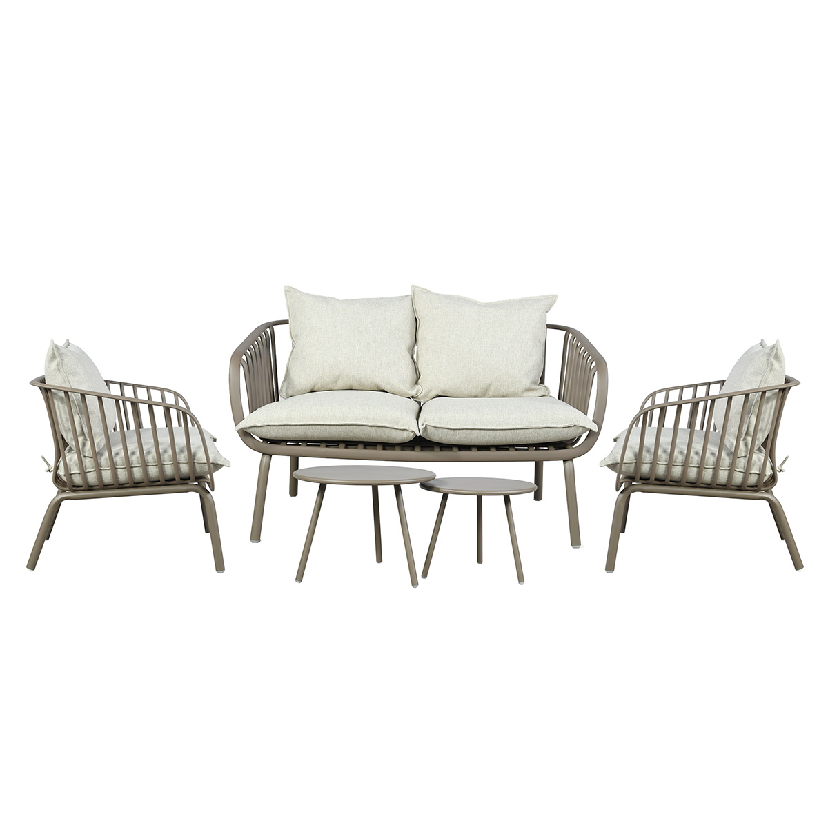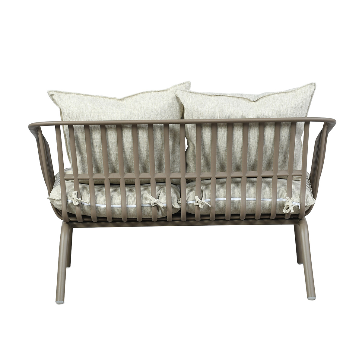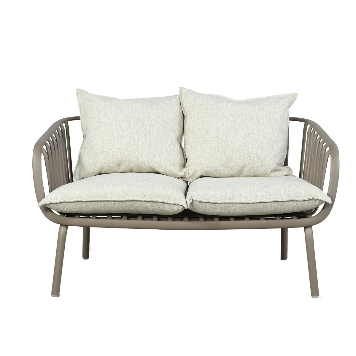Son design moderne, caractérisé par des lignes arrondies et des courbes harmonieuses, apporte une esthétique contemporaine à votre terrasse ou à votre jardin. Le canapé est accompagné de deux coussins beiges chinés confortables, pensés pour offrir une assise agréable et prolonger les moments de détente en extérieur.