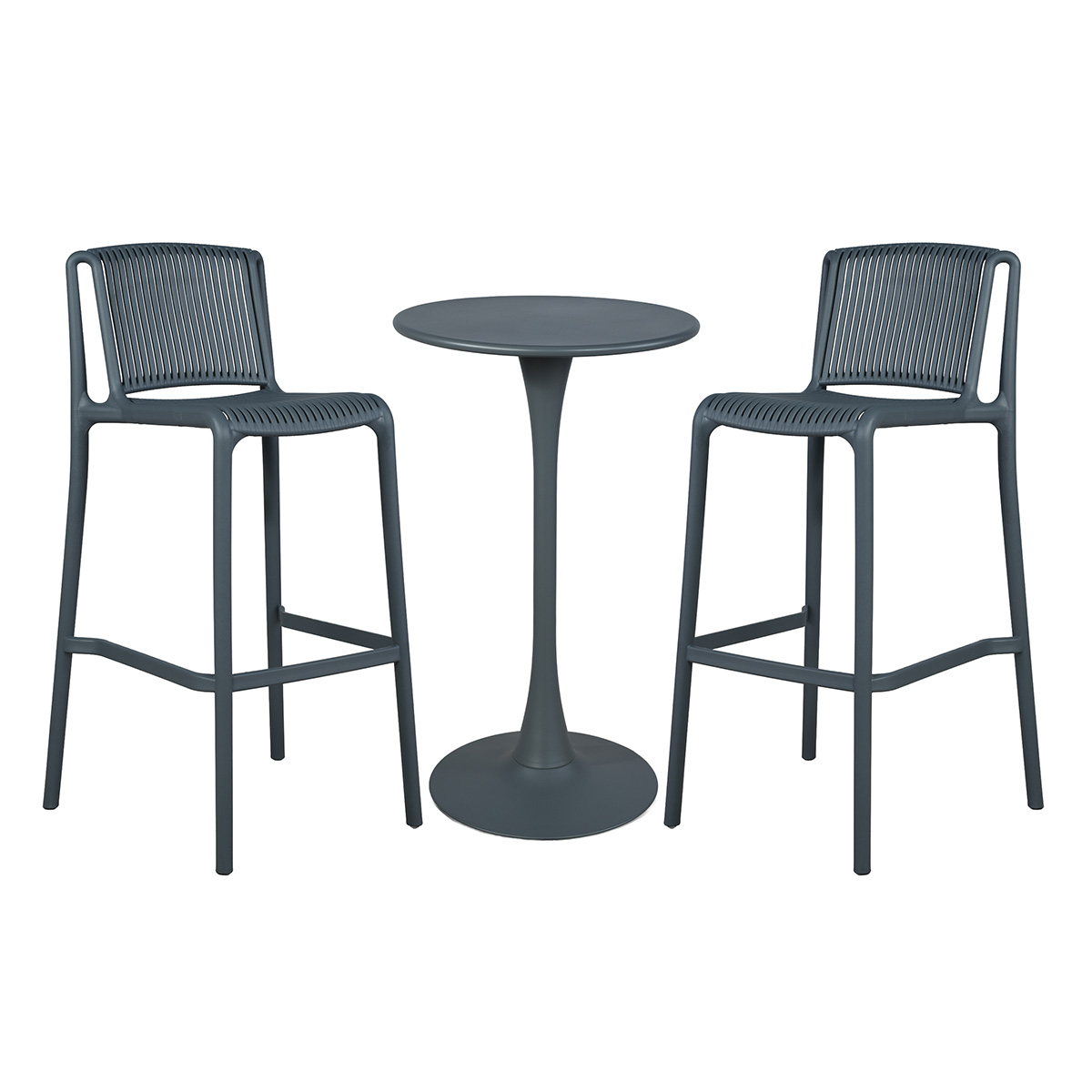 Fabriqué en résine polypropylène, ce salon de jardin haut est léger, robuste et très simple d’entretien. Les chaises empilables facilitent le rangement. La table haute est en acier. Un revêtement en epoxy est ajouté à nos tables. Cette finition garantit une excellente résistance aux intempéries.